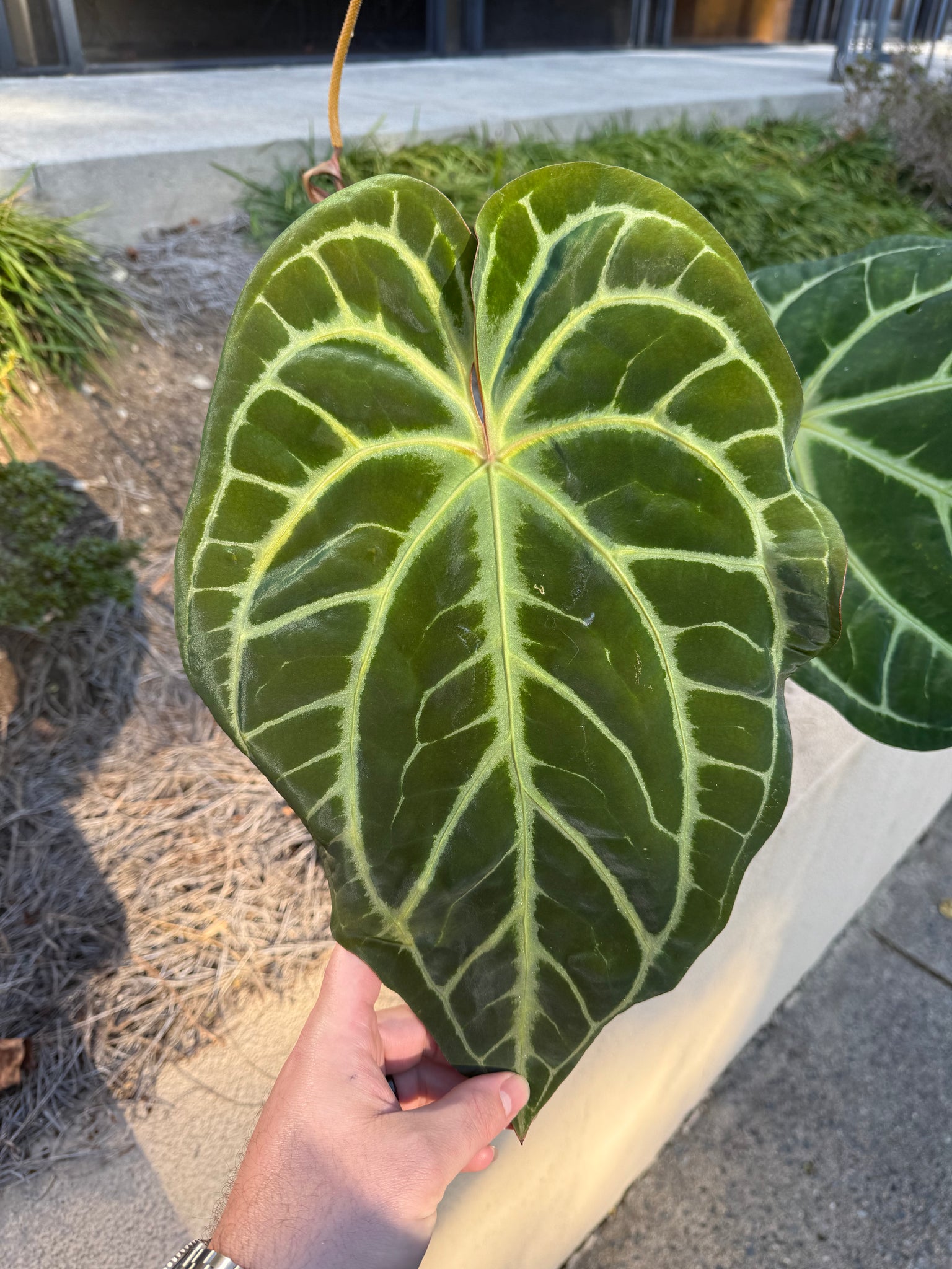 Thick, shimmering silver veining that bleeds outward across the leaf